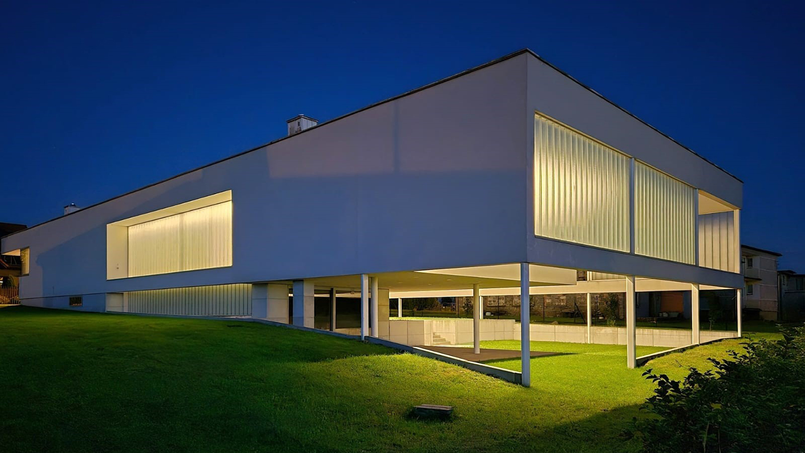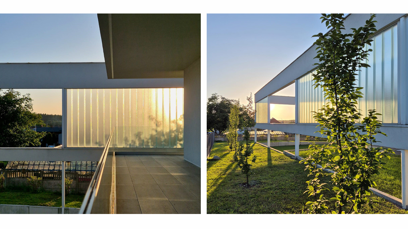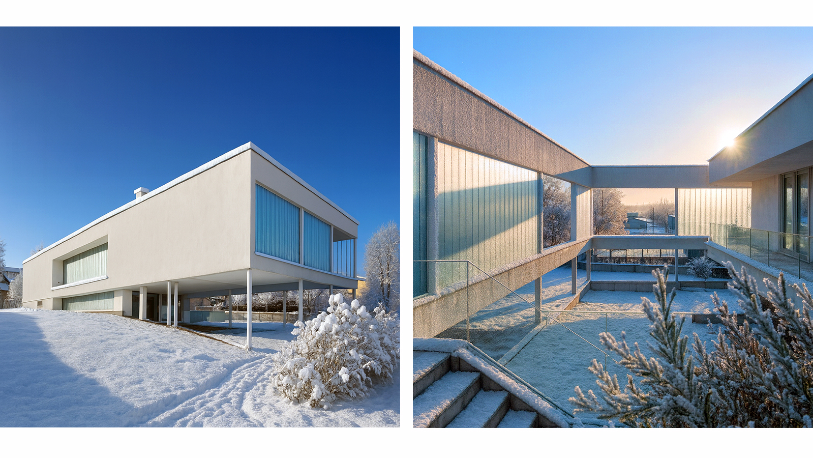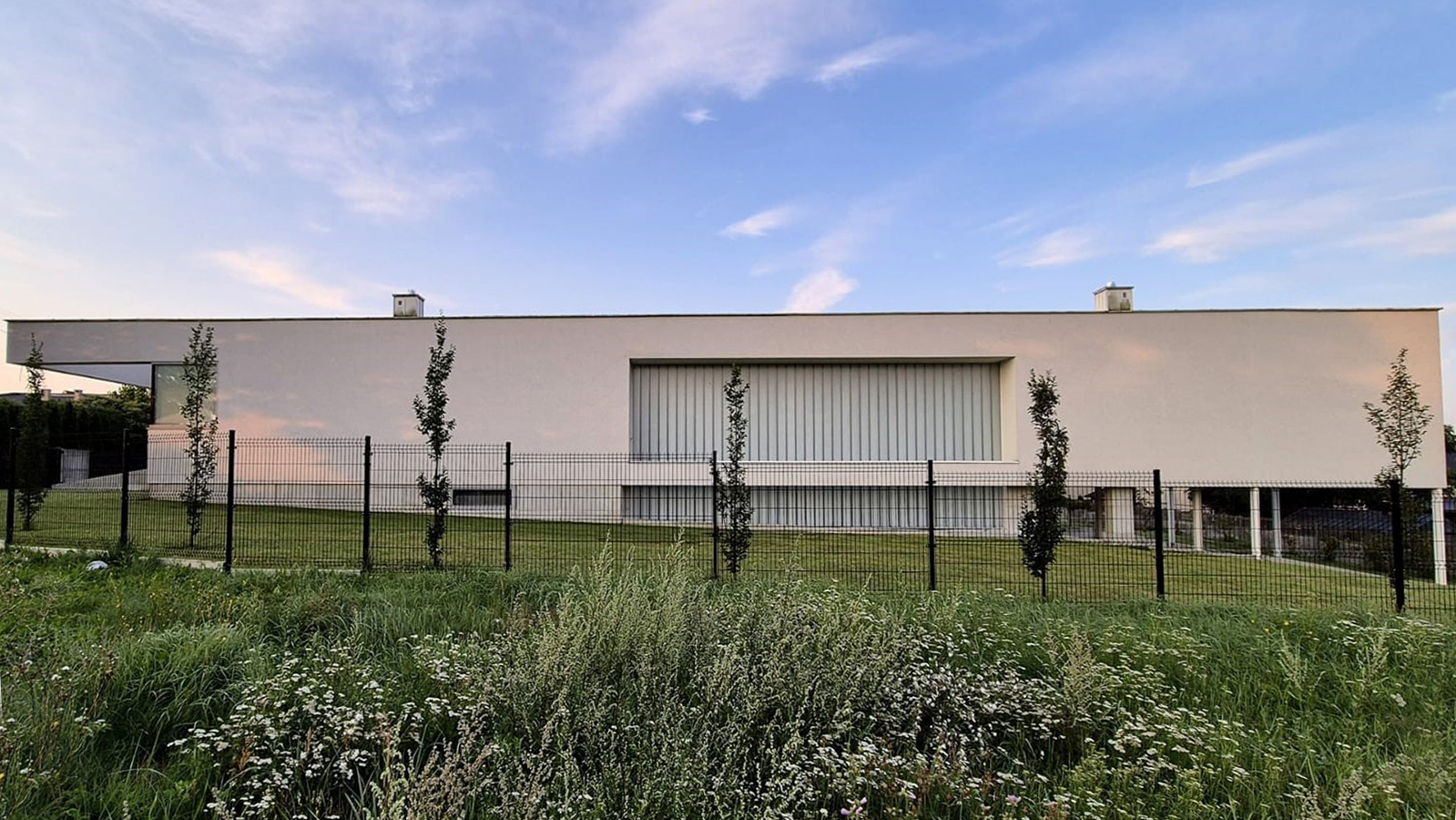 Bryła domu Mirage to harmonijna kompozycja białych płaszczyzn ścian i panoramicznych ram wypełnionych szkłem, które zaprasza światło do wnętrza. Biały tynk Baumit nadaje lekkości i czystości formie, podkreślając ultranowoczesny charakter oraz tworząc spójną więź z otoczeniem i jego zmiennym obrazem.