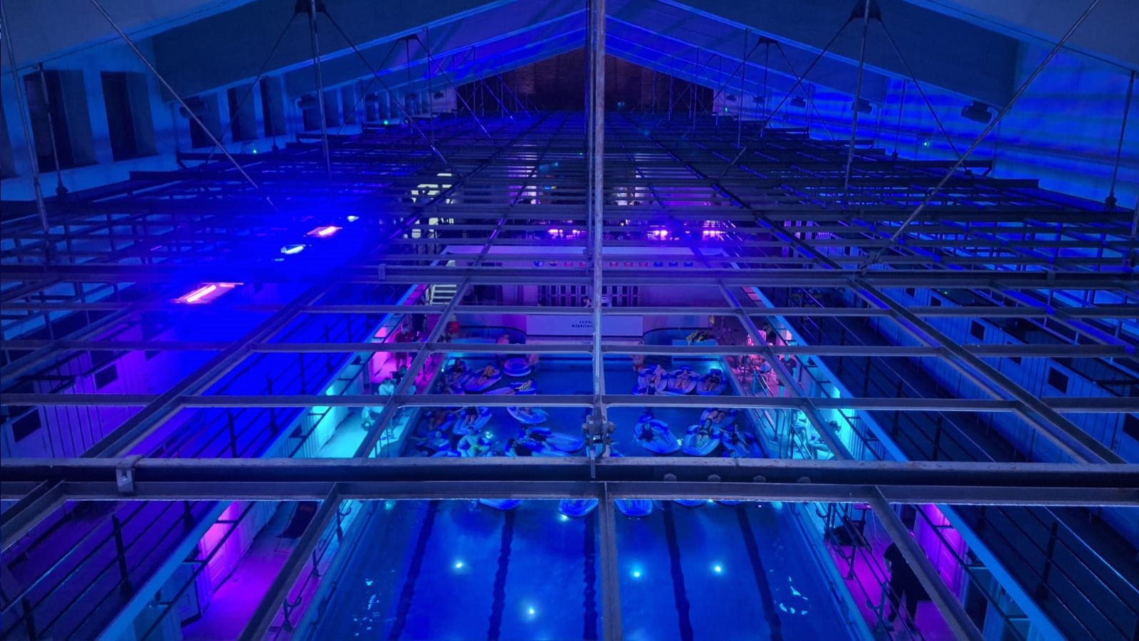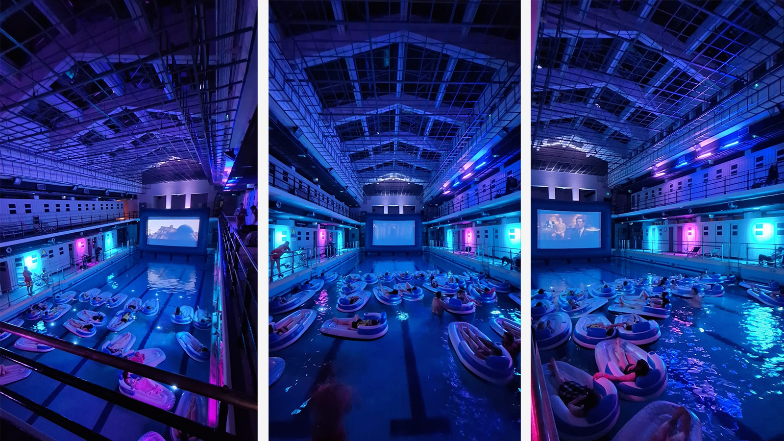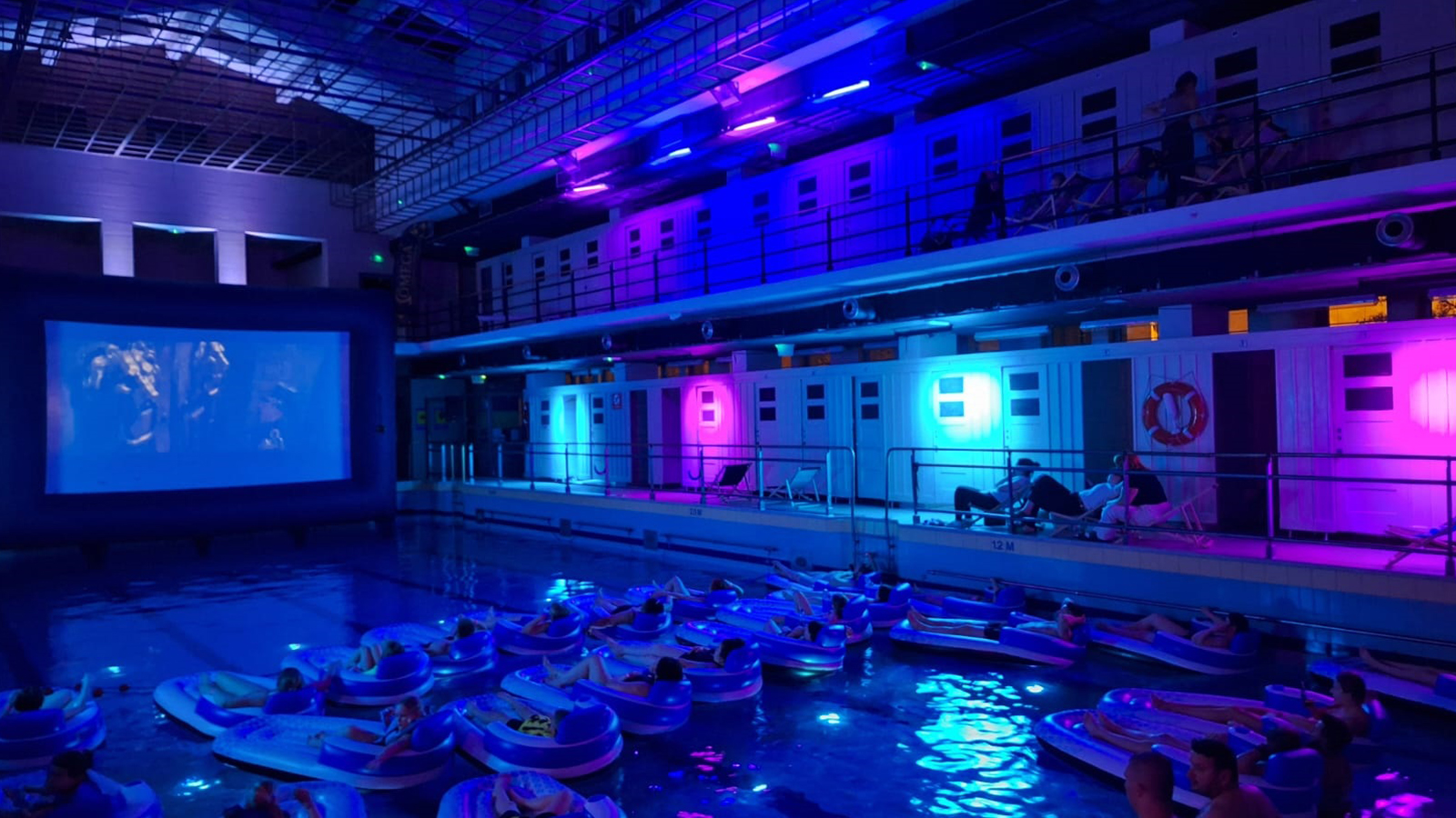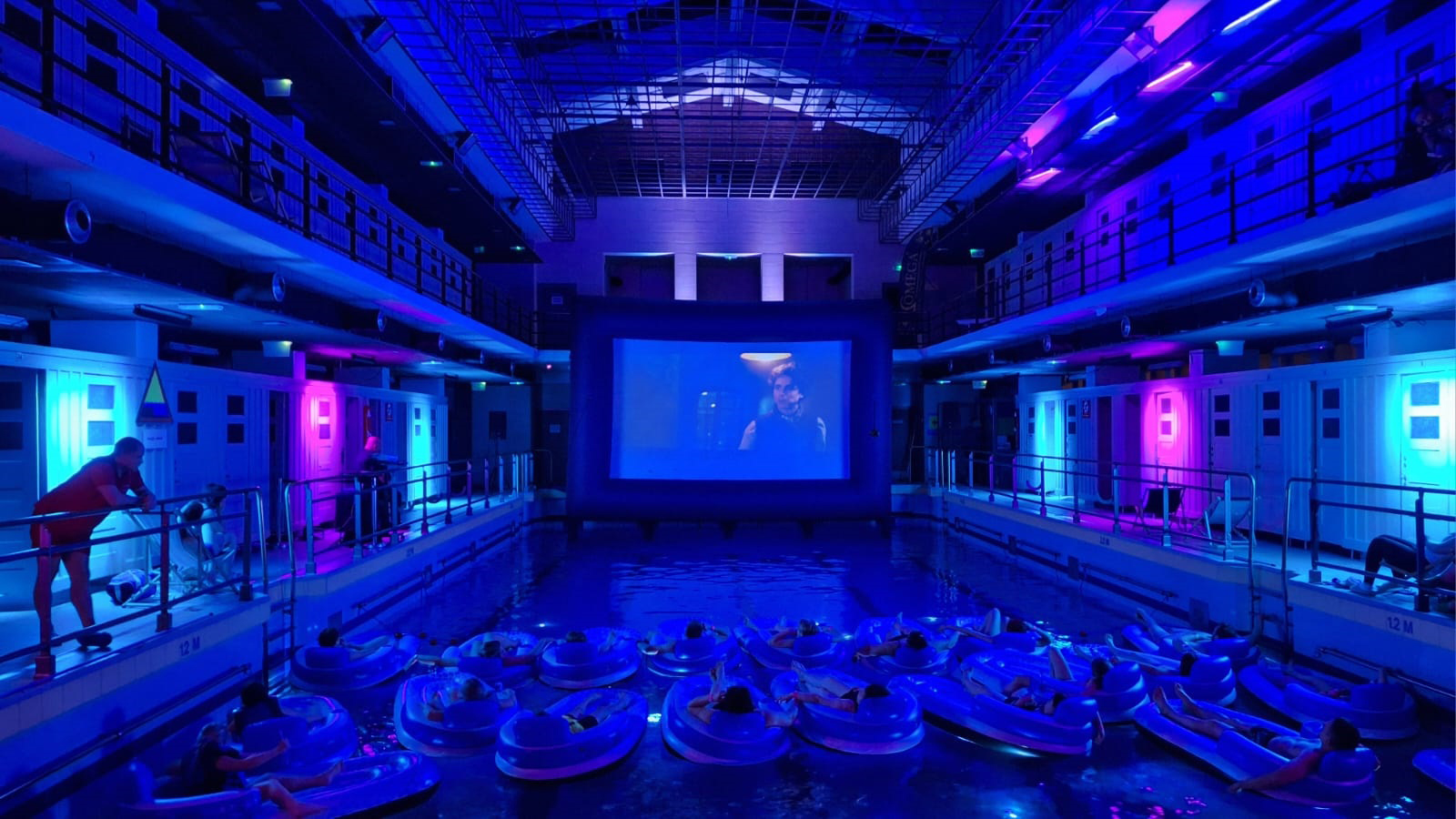 Po raz pierwszy w historii tego wyjątkowego obiektu odbyła się projekcja filmu 😊 “Czekolada” [Willy Wonka i fabryka czekolady]. Nie był to jednak zwykły seans. Widownię tworzyły materace unoszące się na wodzie, a całe wnętrze zamieniło się w niemal nierzeczywistą scenę, zawieszoną gdzieś pomiędzy kinem, snem i architekturą.